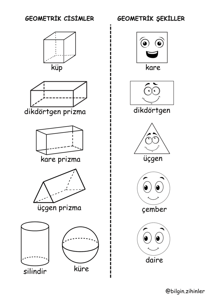 Geometrik ŞEKİL mi, Geometrik CİSİM mi? Soruda şekil soruyor ancak küp diye cevap geliyor, cisim soruyor kare cevabı geliyor derken böyle bir çalışma hazırlama ihtiyacı duydum. Bir tarafta şekiller, bir tarafta cisimler.